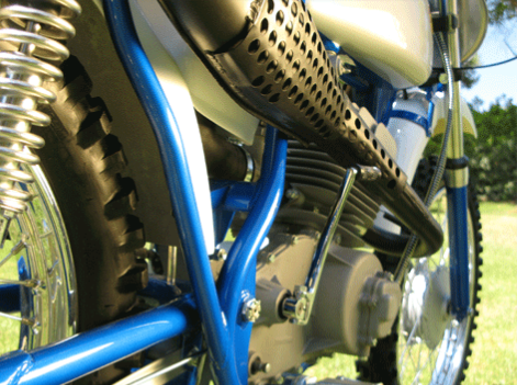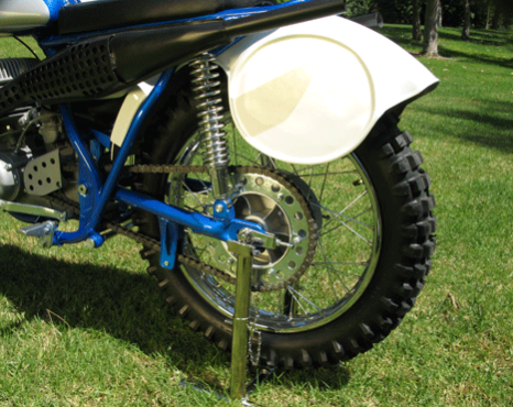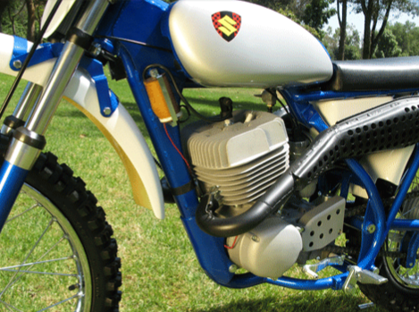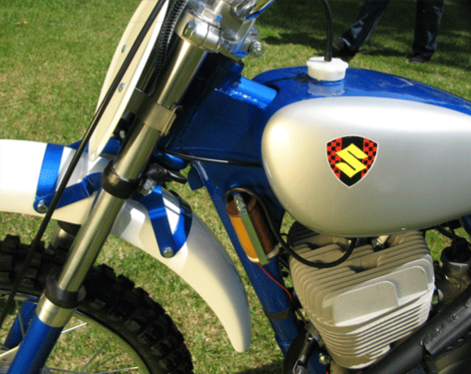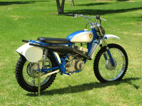 This is arguably the most sought after vintage motocross bike on the planet. Suzuki decided in 1966 to begin the process of building a motocross bike to compete with the Huskys and CZ’s of the period. The first Suzuki prototypes were modeled after the CZ Twin Port race bikes. Suzuki’s first generation of motocross machines in 1966 were dismal as the bikes were heavy and handled terribly. In 1967 the factory assembled a race program based on a new and improved version called the Suzuki RH 67. Although still heavy and suffering from poor handling, the factory built approximately 112 of these bikes which they called the TM. About sixty of these TM’s came to America along with a two page questionnaire asking for any input the riders could provide. This included any modifications from which the bike benefitted. Suzuki also hired Ole Petterson away from the Husqvarna team to be the designated test rider/developer. Suzuki took the information learned from these TM’s and from Ole Petterson and within two years won the 250 CC and 500 CC World Championships with the help of Joel Robert and Roger De Coster.