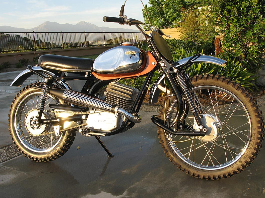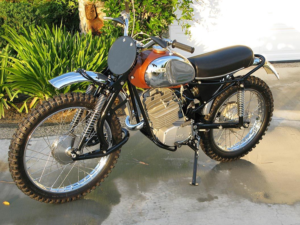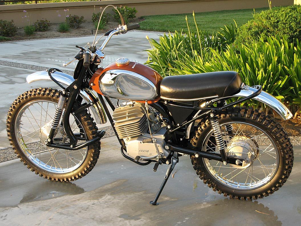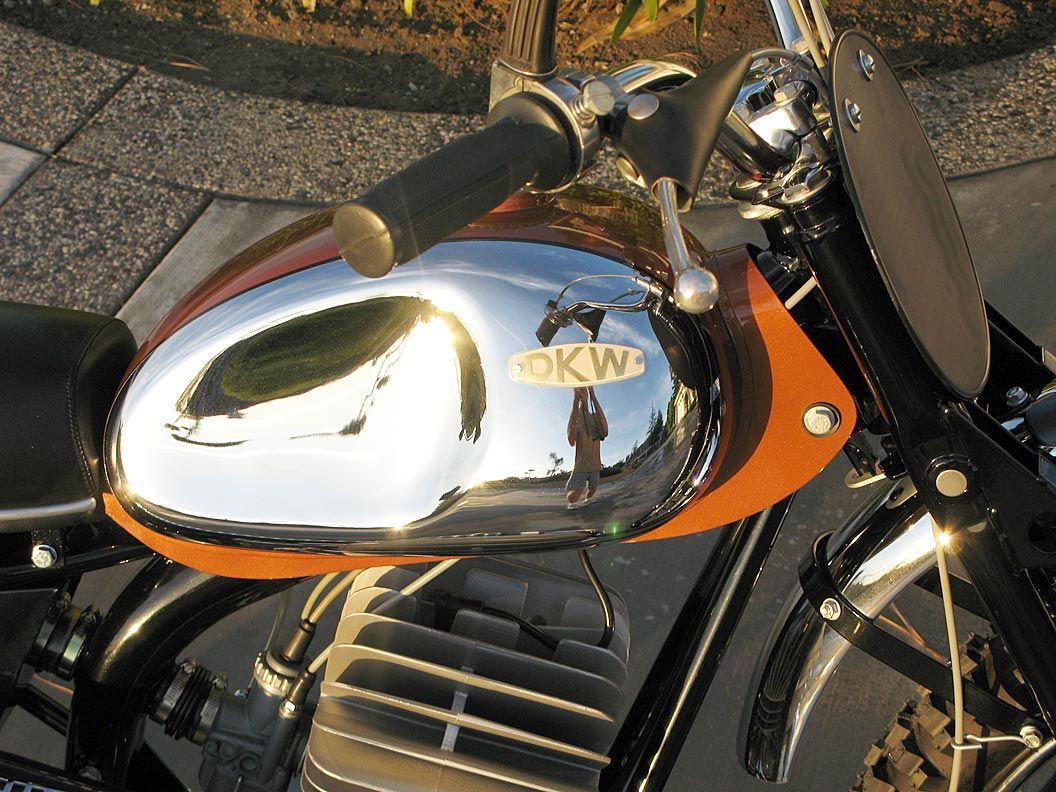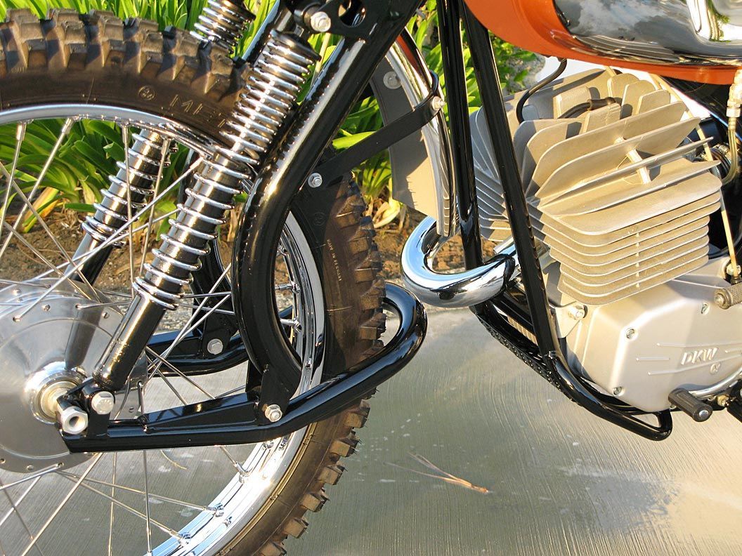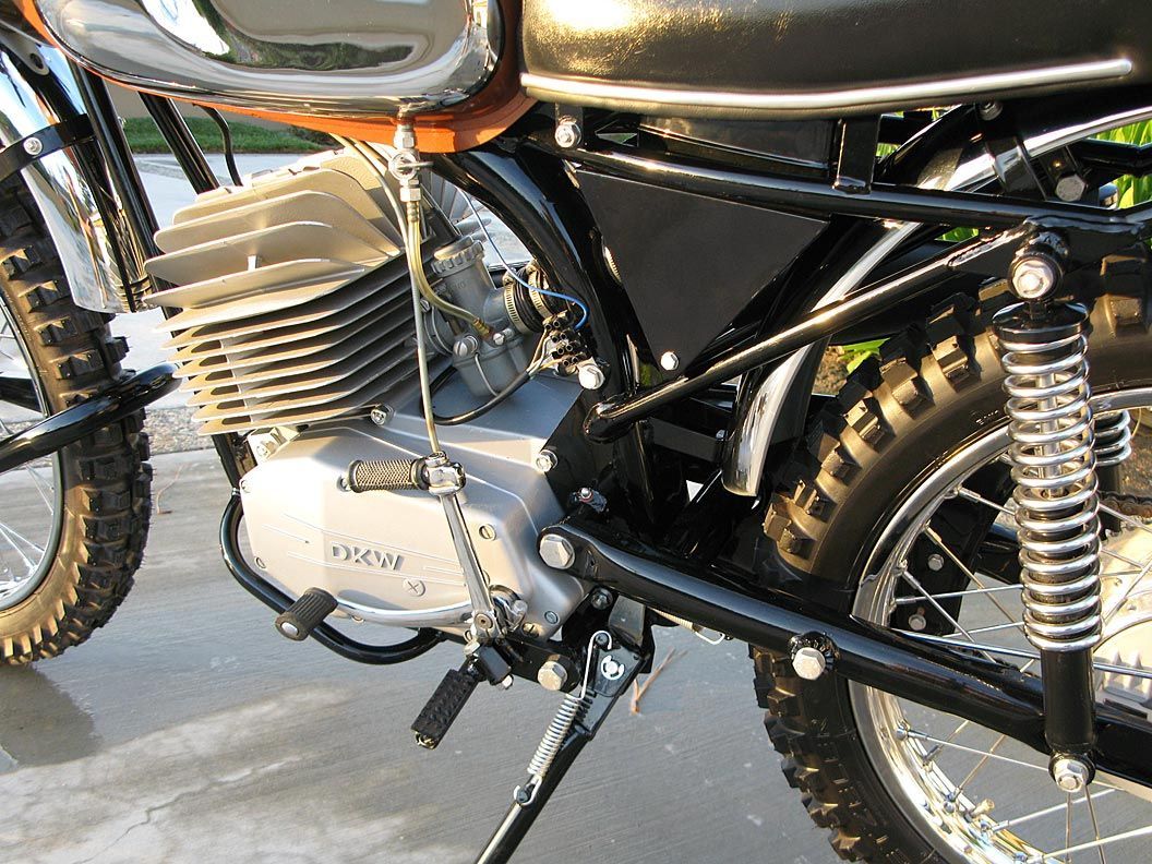 This bike is probably the most correct DKW of this year in the United States. I purchased the South Eastern USA Sachs/DKW inventory in 1998, specifically to acquire all of the difficult to find parts needed to build this bike. The basic core of the bike was given to me by one of my friends that I used to race against with my Penton, Mike Skelton. The bike has the Metzeler tires that it came with in 1971. All the parts on this bike are either NOS or rebuilt with NOS parts. This bike is a multiple award winner and was featured in VMX Magazine. This is truly a special bike and very awkward to ride. The front end comes up when applying the front brakes in a turn. You have to have wrists of steel.