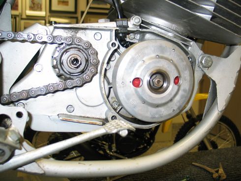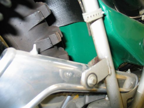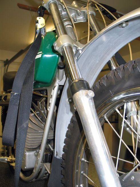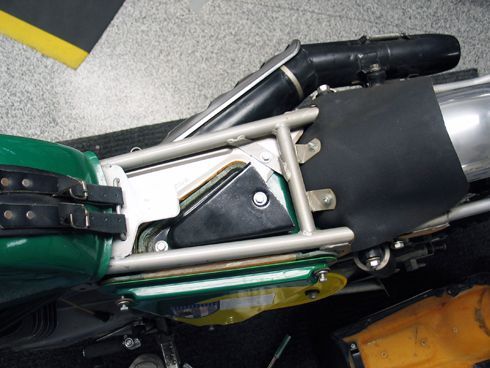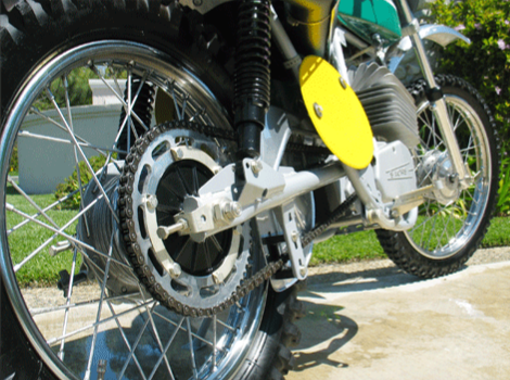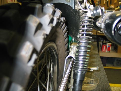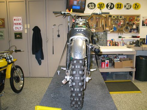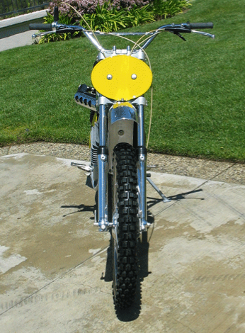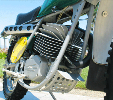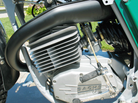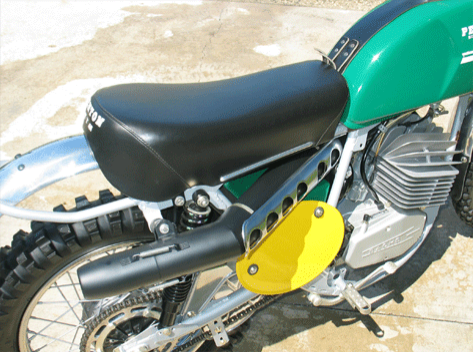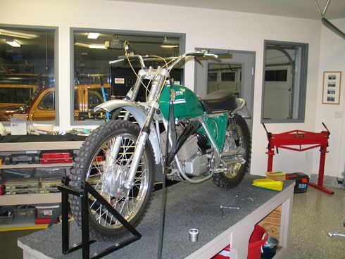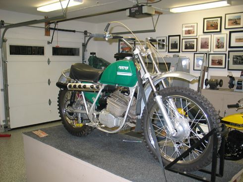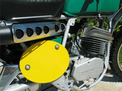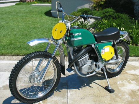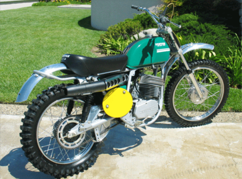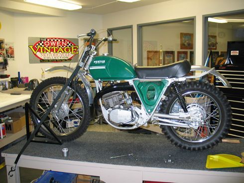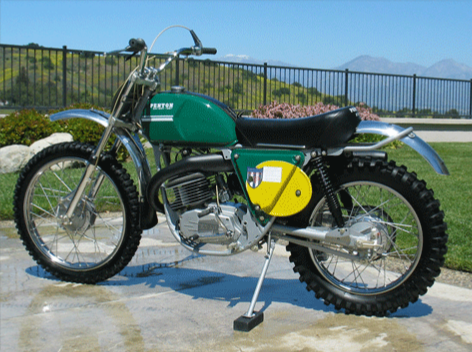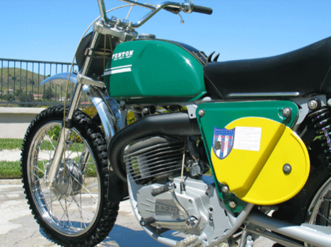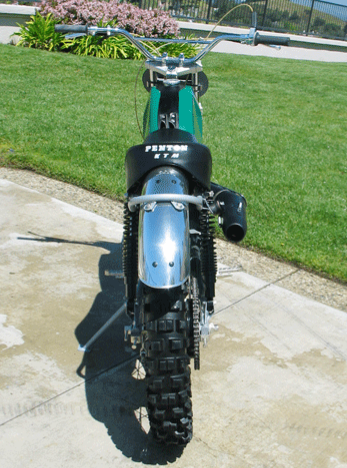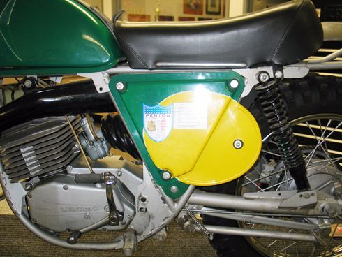 This Penton was found in Oregon and was originally purchased to drive a man and his disabled son to town. The bike was fitted at the dealer with an aftermarket light and speedo kit as well as a rear view mirror. The man made only a few trips to town and never went off-road. Total mileage was recorded at 400 miles, all on the street. The bike is fully original except for the frame paint, pipe paint, cad plating and two oval number plates which were removed at purchase. One grip and the kick start rubber were also replaced. This Penton has all of the original green painted fiberglass, original fenders, shocks and chain guard, complete rims with original tires and painted spokes. All chrome is original as are the cables, chain, seat, forks, and all hardware. The motor still has the original hone marks on the inside of the cylinder. The bike runs and shifts perfectly and has excellent power. Check out the side number plate, it has virtually no wear and still has the original warranty sticker. The rear tire is worn only at the center knob, I don’t believe he ever turned!